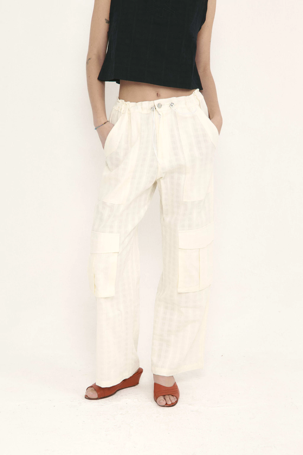 Pantalón Cargo de Algodón con textura cuadrialle. Posee 2 tancas con elástico para ajustarlo tiro bajo o medio.